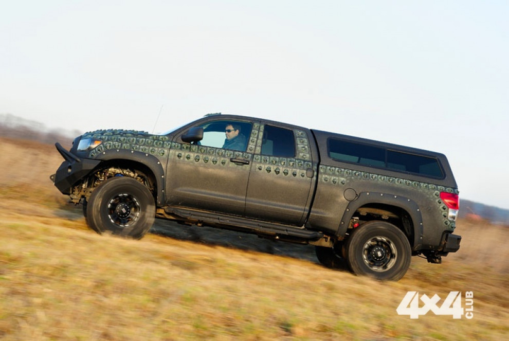 Эта Toyota Tundra 2008 года выпуска доработана согласно всем классическим канонам российского «Tundra-тюнинга». Бодилифт на 6 дюймов, новые пружины и рессоры в подвеске, построенной на компонентах Koni. Уже примелькавшиеся 18-дюймовые диски Monster XD с 37-й резиной Mickey Thompson Baja ATZ, кунг A.R.E, силовые бамперы и пороги от российского производителя 4х4 Tundra. Обязательная линзованная оптика Hella и модные светодиодные дополнительные световые приборы. В общем, все довольно банально и привычно, не правда ли? Но внешний вид этого автомобиля вызывает сильнейший культурный шок у любого неподготовленного зрителя. Впечатлительные дамы бальзаковского возраста падают в обморок, маленькие дети обходят машину стороной, а суровые мужчины одобрительно кивают бритыми головами. И надо сказать, такая реакция вполне оправданна.
