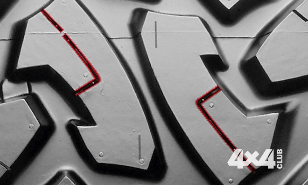 Рассмотрим особенности дизайна протектора таких шин на примере популярной грязевой покрышки Toyo Open Country MT. Прежде всего, рисунок очень агрессивный, блоки имеют крючкообразный профиль, позволяющий вгрызаться в любой грунт буквально зубами. Открытые, почти прямоугольной формы плечевые ламели работают как шестерни, заглубляются в колеи и позволяют выехать, даже если эти колеи очень глубокие и скользкие. Но и это еще не всё! Рисунок протектора этой MT-покрышки не заканчивается плечевой зоной, а продолжается дальше, на боковине шины. Для чего это сделано? Мало кто знает, что при высокой артикуляции подвески шина зачастую находится в контакте с грунтом только своей боковиной. И, конечно же, покрышка, имеющая грунтозацепы на боковине, в такой ситуации будет работать гораздо эффективнее.