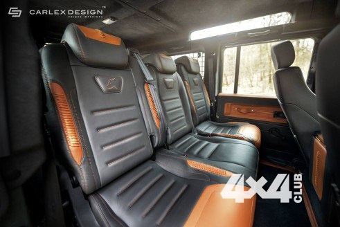 Салон автомобиля получил комбинированную отделку из чёрной и рыжей кожи высочайшего качества. Потолок Дефендера затянули в алькантару, а на спинках сидений присутствует логотип Nakatanenga.