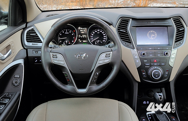В салоне Grand Santa Fe, словно в кабинете премьер-министра экономически успешной страны, – в меру дорого, в меру строго, в меру торжественно. Наверное, такой кабинет у самого Петера Шрайера в его дизайн-центре в Рюссельсхайме. Смелые линии центральной консоли, подросший до восьми дюймов главный дисплей, качественные кожа и пластмасса. Придраться особо не к чему! Разве что досаждает шум на ходу, особенно во втором ряду. Зато климатическая установка, на зависть конкурентам, работает идеально – важный момент, учитывая длину семиместного салона. Стандартную проверку лёгким бездорожьем Hyundai прошел неплохо, хотя ему и пришлось побуксовать в растаявших снежных колеях.