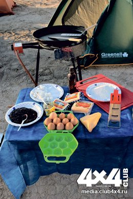 Солнце уже встало, а участники автомобильной экспедиции и не думали подниматься – все устали после нескольких дней скитаний по безжизненным пространствам. Ещё немного и станет жарко, но что может их разбудить? Возможно, что-то особенное на завтрак, домашнее, отличающееся от обычного бутерброда или каши быстрого приготовления. На ура в таких случаях всегда идут два блюда: огромная яичница и блины с разнообразной начинкой. По скорости приготовления они приблизительно одинаковы, но блины позволяют угодить вкусам всех участников пробега – каждую порцию можно сервировать по спецзаказу! С яичницей сложнее, практически все ингредиенты надёжно спекаются в единое для всех блюдо. А кому-то принципиально не нравится лук, который я обычно в изобилии кладу с яйцами, кому-то помидоры или зелень, некоторых не устраивают полоски поджаренного чёрного хлеба или запах какой-нибудь пряности, кориандра, например.