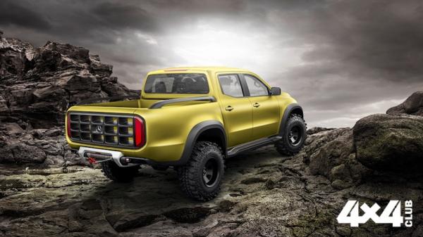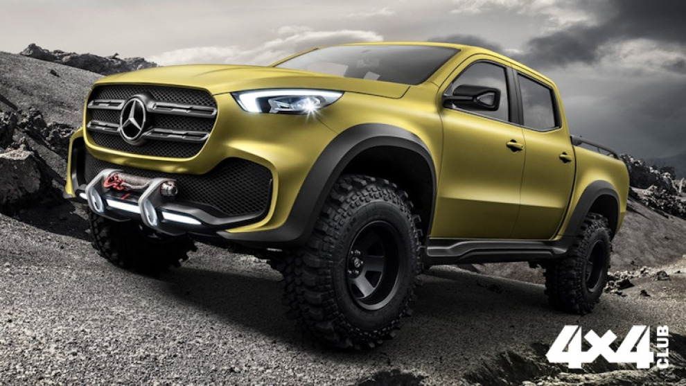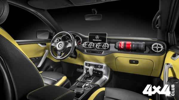 Mercedes-Benz X-Class powerful adventurer предполагает наличие внедорожных шин, защиты нижней части кузова и защитного обвеса из карбона, электрической лебедки, а также буксировочного крюка сзади. Такая версия прототипа выкрашена в желто-зеленый цвет.