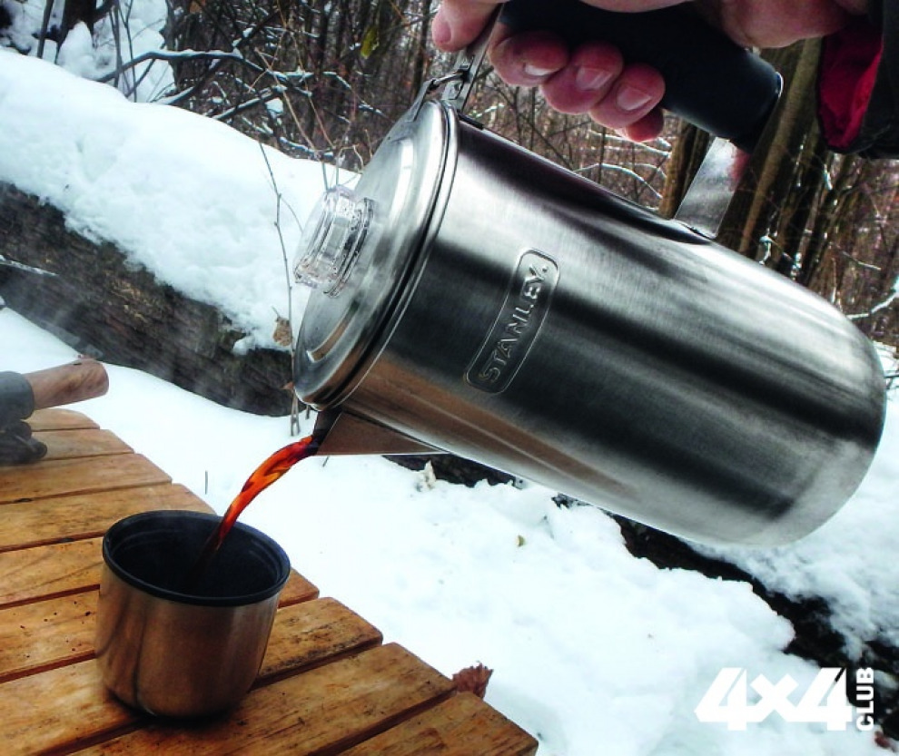 История нашей компании Stanley началась с того, что в 1913 году американский учёный-физик Уильям Стэнли-младший совершил открытие. Ему удалось создать цельнометаллическую вакуумную бутылку. Она-то и стала отправной точкой. А дальше, в полном соответствии с теорией большого взрыва, эта точка стала стремительно расширяться, и сегодня компания выпускает уже сотни вариантов металлических термосов и высококачественной посуды из нержавеющей стали – домашней и походной. И этой походной посуды с каждым годом всё больше… Впрочем, из всего металлического многообразия нам интереснее всего герой, подобно первопроходцу-скауту стоящий особняком. Называть его кофеваркой как-то язык не поворачивается. По-английски звучит ещё куда ни шло – coffee maker. Однако по сути своей это кофейник с гейзером и контейнером для кофе внутри. Конструкция проста и с 1881 года практически не менялась. Четыре детали. Потерять их сложно, разве что погнуть, наступив. Объём собственно кофейника – литр, или шесть чашек кофе. Минимум, который получается, если наливать воду до нижней метки – две чашки. Соответственно, в контейнер входит шесть столовых с горкой ложек кофе крупного помола. Крупный помол – это как морская соль, не мельче, иначе часть кофе просыплется и протечёт сквозь отверстия контейнера и вкус будет слишком сильным. Надо сказать, перколятор вообще усиливает вкус кофе, поэтому для него подойдут сорта умеренные, например, южноамериканские. Если нет возможности выбирать помол, то можно вложить в контейнер обычный бумажный фильтр или, на крайний случай, сложенный в несколько раз и облитый кипятком кусок бинта или любой чистой ткани. Между прочим, пакет с кофе, сахар и даже ложки можно хранить и в самом перколяторе – места навалом, но укладывая, нужно вспомнить игру в «тетрис».