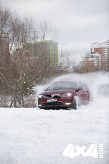 Обычно фотосъёмка кроссоверов происходит примерно так. Пилот делает несколько кругов, стараясь поднять в воздух как можно больше снега, а потом десять минут все ждут, пока муфта подключения полного привода остынет или охладится автоматическая коробка. И так четыре-пять раз подряд, пока не удастся поймать нужный кадр. Из-за остановок на это порой уходит довольно много времени. Но не в этот раз! VW Tiguan носился по полю, как курица без головы, и ни его коробка с двойным сцеплением, ни муфта не дали нам ни малейшего повода перекурить. Крайне надёжная конструкция! Однако ещё большее восхищение вызвала подвеска.