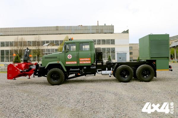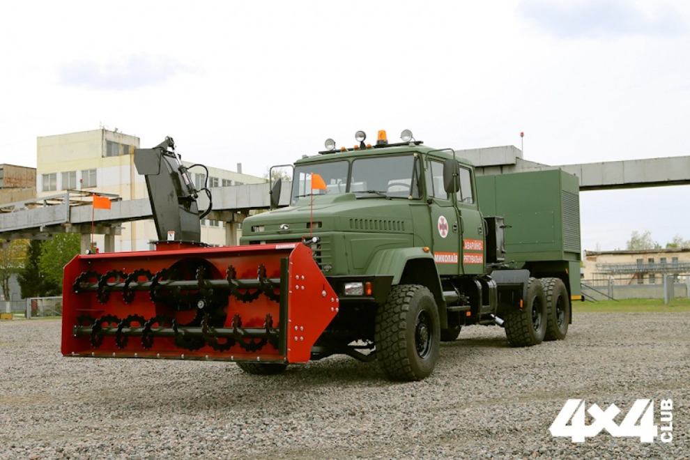 Новинка построена на «заслуженном» полноприводном шасси КРАЗ-6322, которое оснастили шнекороторной установкой и отвалом для уборки снега. Автомобиль создан для части технической службы ГУ ГСЧС Николаевской области.