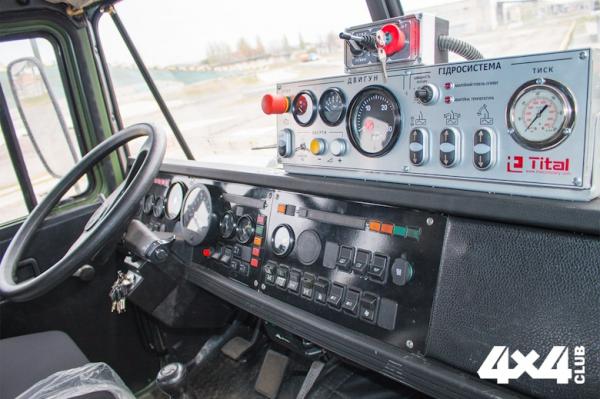 Стоит обратить внимание, что для привода шнекоротора на шасси смонтирован отдельный дизельный двигатель, который расположен над задней осью грузовика, чтобы улучшить развесовку. Управляется установка пультом украинской марки Tital.