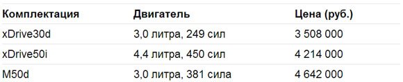 На первом этапе автомобиль будет доступен в трех модификациях: X6 xDrive30d, X6 xDrive50i, X6 M50d мощностью 249 л.с., 450 л.с. и 381 л.с. соответственно. Стандартное оборудование BMW X6 предусматривает задний парктроник, круиз-контроль, спутниковую противоугонную систему, биксеноновые фары головного света, кожаный салон, аудиосистему с 6,5-дюймовым цветным дисплеем, двухзонный климат-контроль, обогрев передних сидений, 19-дюймовые легкосплавные колесные диски с шинами Run Flat и болтами секретками, селектор режимов движения с функцией ECO PRO, кожу и светодиодную подсветку салона.