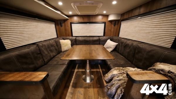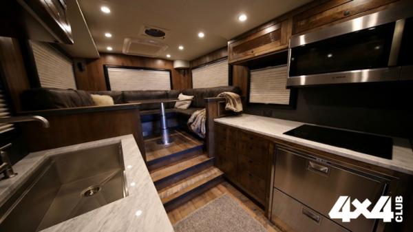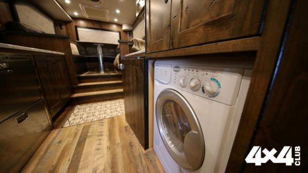 К услугам пассажиров — санузел с раздельными душем и туалетом, кухня с трехконфорочной индукционной плитой и микроволновкой, два холодильника и даже стиральная машина с функцией сушки. За развлечения отвечают два телевизора (диагональю 43 и 32 дюйма) и аудиосистема Bose с объемным звучанием. Пол, стены и шкафчики — из натурального дерева с фурнитурой из нержавеющей стали, а кухонные рабочие поверхности — мраморные. Снаружи машина оборудована выдвижным грилем и душем: в плохую погоду с его помощью можно помыть обувь, одежду или собаку.