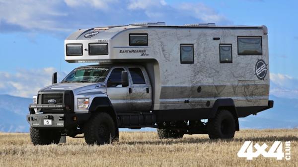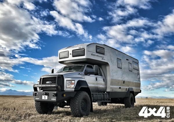 До сих пор самыми крупными машинами фирмочки из колорадского городка Даконо были моторхоумы EarthRoamer XV-LTS длиной 8,8 м на полноприводном шасси грузовика Ford F-550. Однако на днях компания представила по-настоящему огромную модель EarthRoamer XV-HD: 10,7 м в длину и 4,1 м в высоту! Экспедиционная машина построена на модифицированном шасси грузовика Ford F-750 — с полным приводом, пневматической задней подвеской c амортизаторами Fox и зубастыми шинами Michelin XZL диаметром 46 дюймов.