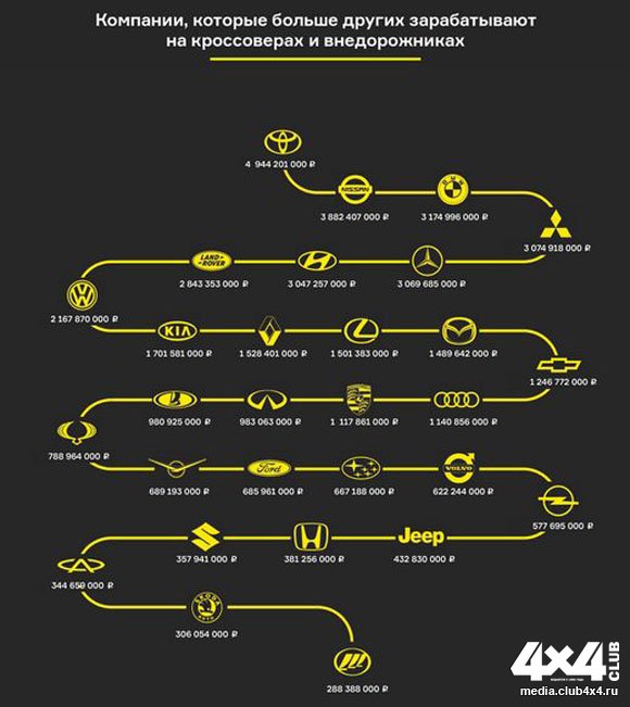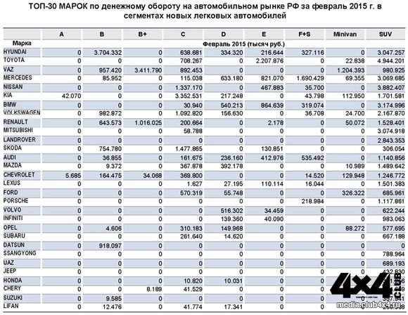 Федеральное аналитическое агентство «Автостат» провело анализ финансовых потоков по 30 маркам автомобилей и свело все данные результатов продаж в разных сегментах в единую таблицу, где внедорожники, пикапы и кроссоверы объединены в единый сегмент SUV. Лидером во внедорожном сегменте стала Toyota, ее денежный оборот составил 5 миллиардов рублей, что больше, чем во всех других сегментах вместе взятых. И это только за февраль 2015 года.