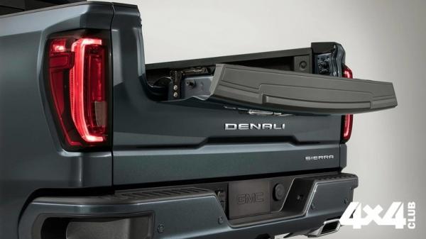 В новом пикапе облегчен не только кузов. Двери, капот и задний откидной борт выполнены из алюминия, что позволило большому траку "похудеть" сразу на 163 кг. Сам откидной задний борт тоже заявлен как уникальный. Он открывается сервоприводом и имеет встроенную складную секцию, которая работает как подножка, скамейка, стол или упор для длинного груза. Такой задний борт доступен только для Sierra.