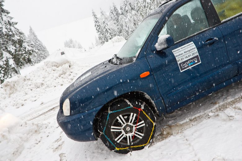 В ближайшей деревне перед перевалом я заехал на заправку и купил цепи противоскольжения. Я очень хорошо понял, чего могла стоить моя небрежная приверженность символам М+S, «снежинке и трём горным пикам» на боковине шин. Сам процесс покупки и установки цепей тоже был очень забавным: нужного мне размера цепи нашлись только в загашнике у хозяина, а мастером оказался дядя Саша из Молдовы, настойчиво попросивший его не фотографировать.