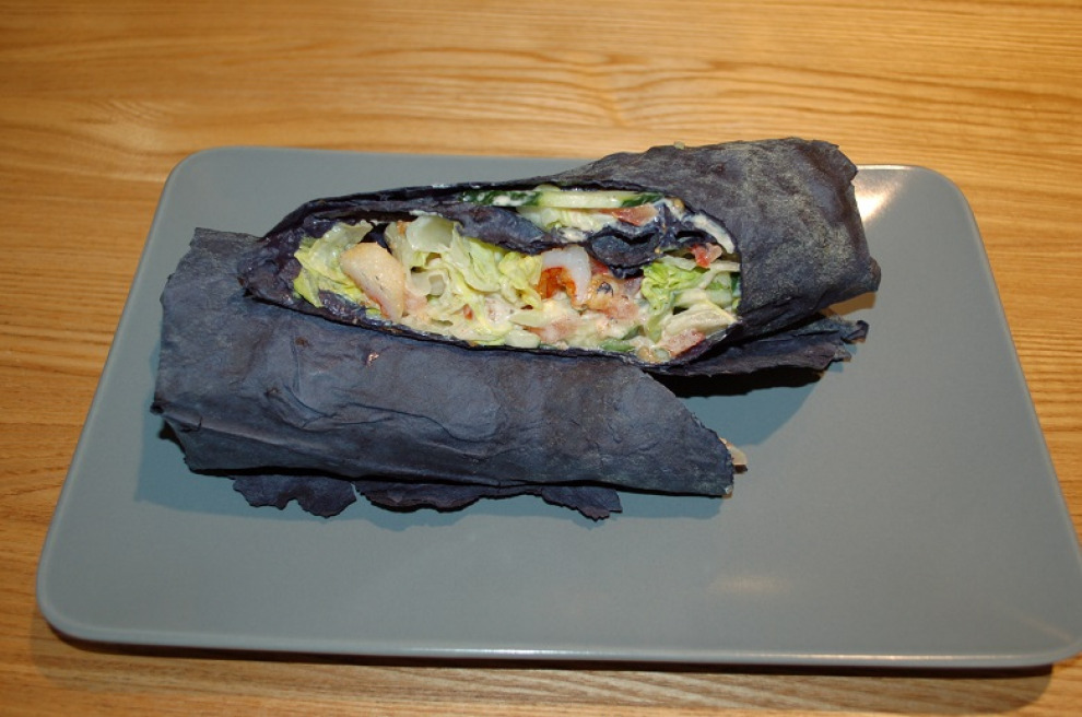– Лаваш чёрный, капуста китайская или мелко нашинкованная белокочанная, очищенные свежие огурцы (нарезанные соломкой), томаты (нарезанные кольцами), лук репчатый, соус спайси, салат «Коул Слоу», масло трюфельное, креветка или слегка обжаренная куриная грудка, кукуруза (подойдёт и пара ложек баночной).