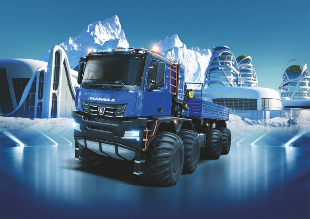 КАМАЗ разработал вездеход для работы на севере: его главная особенность — шарнирно-сочленённая «ломающаяся» рама. У полноприводного автомобиля может быть колёсная формула 6х6 или 8х8. При этом колёса не поворачиваются, а отклоняется передняя часть автомобиля.
