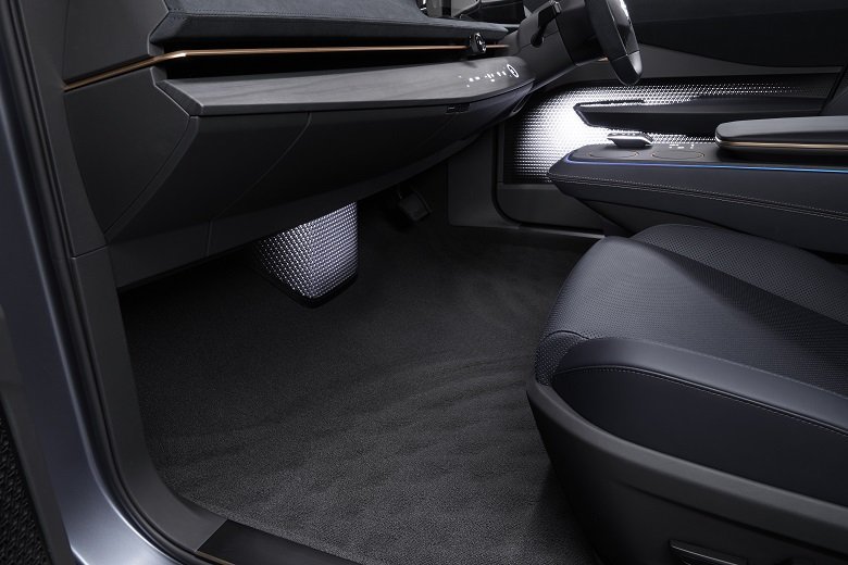 Передняя панель в Ariya предельно компактна, а сиденья по сравнению с машинами нынешнего модельного ряда более тонкие. Кроме того, специалисты компании уделили особое внимание выбору материалов отделки салона – из-за изменения его конфигурации и оригинального распределения света, покрытия выглядят весьма необычно.