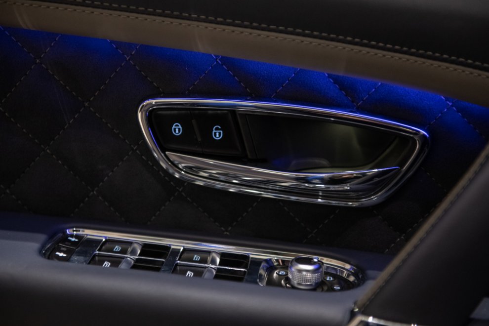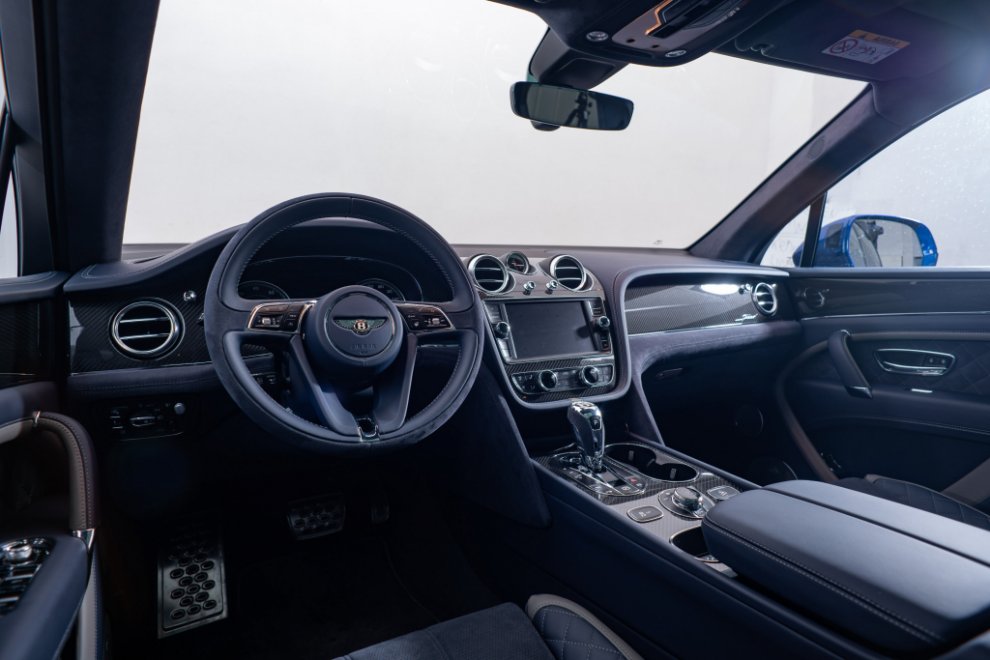 Повторю, версия Speed состоит из множества уникальных деталей – как снаружи, так и внутри. Например, наш автомобиль был выкрашен в цвет Moroccan Blue и обут в 22-дюймовые диски особого дизайна. Решётка радиатора и вентиляционные отверстия чёрные, равно как и рейлинги на крыше. Под передним бампером уставлен углепластиковый спойлер, а боковины снабжены аэродинамической юбкой. Безусловно, вся эта косметика должна подчёркивать невероятную мощь, которая скрывается под капотом, хотя всё понятно и без неё. Зона посадки подсвечивается логотипом марки (хотя сейчас так делают даже в Chery), а сам салон, когда на улице темно, переливается фоновой подсветкой.
