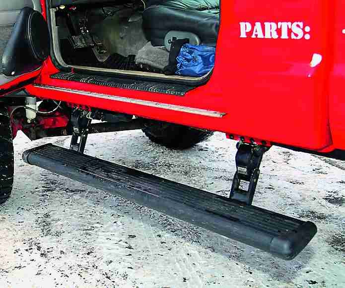 Задний бампер сам по себе изысканностью не блещет, он прост и функционален, зато о системе фаркопа стоит поговорить отдельно. Место крепления имеет усилители, завязанные в единую конструкцию с подрамником грузового отсека, но наибольший интерес вызывает само сцепное устройство. Оно позаимствовано у Jeep Willys 1943 года выпуска, при этом отлично выглядит и исправно работает. Пороги кузова, оснащённые электрическим приводом, опускаются при открывании дверей. Кроме того, в салоне неподалёку от замка зажигания — два тумблера, управляющие ими.
