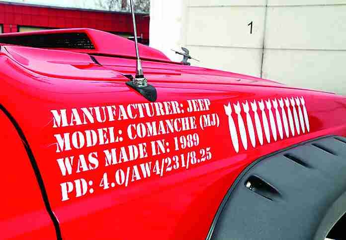 Салон почти не претерпел изменений, разве что была установлена мощная аудиосистема, да под зеркалом заднего вида появилась радиостанция, работающая в СВ-диапазоне. Особый шарм и законченность облику машины придаёт композиция из наклеек, покрывающая весь кузов, как татуировки: текст с техническими характеристиками на передних крыльях, летящий на бомбе Багз Банни на боковых дверях, звёзды на задних крыльях, ну и, конечно же, миниатюрная фигурка индейца над решёткой радиатора.