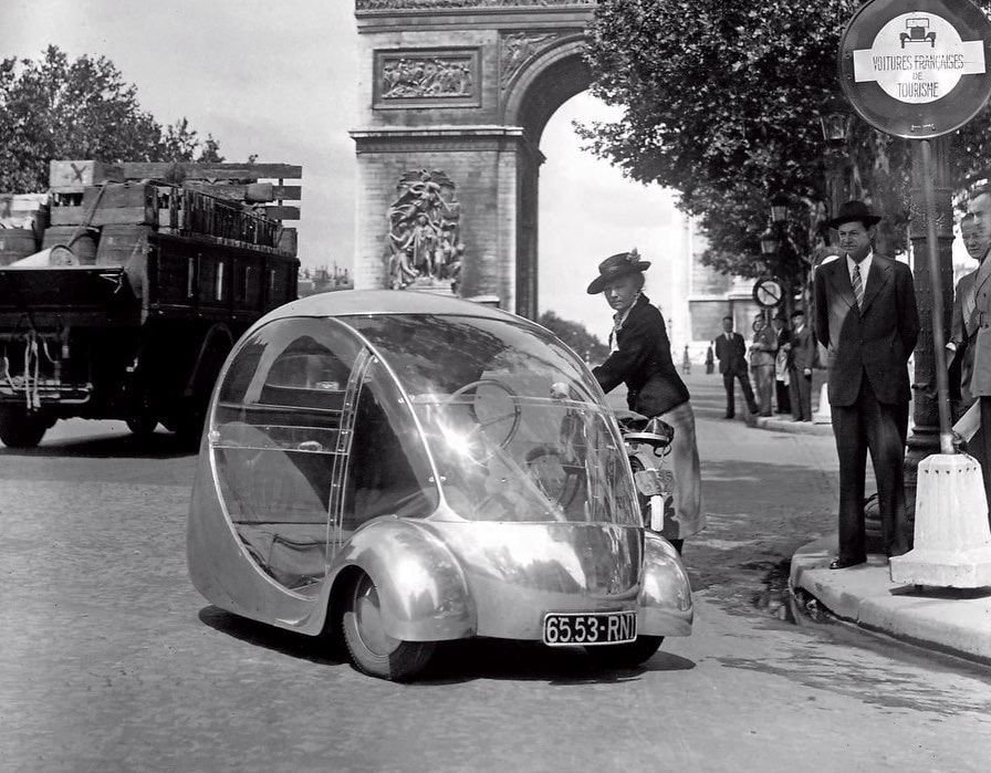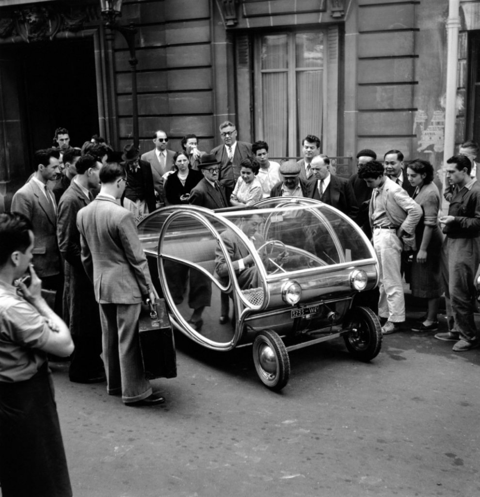 Оккупационная администрация Парижа строго на строго запретила французам покупать топливо. Каждый литр был на счету, а художнику хотелось продолжать творить. В 1942 году он создает «Электрическое яйцо» — прадедушку всех электрических ситикаров на Земле. Автомобиль был выполнен из двух любимых материалов художника.
