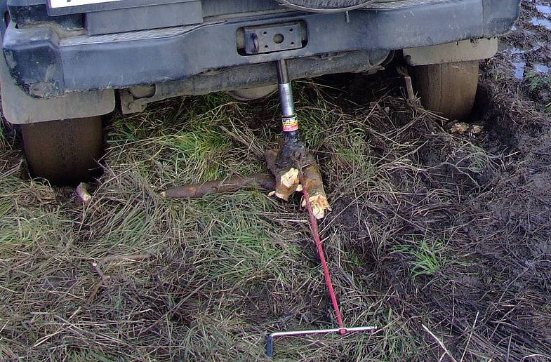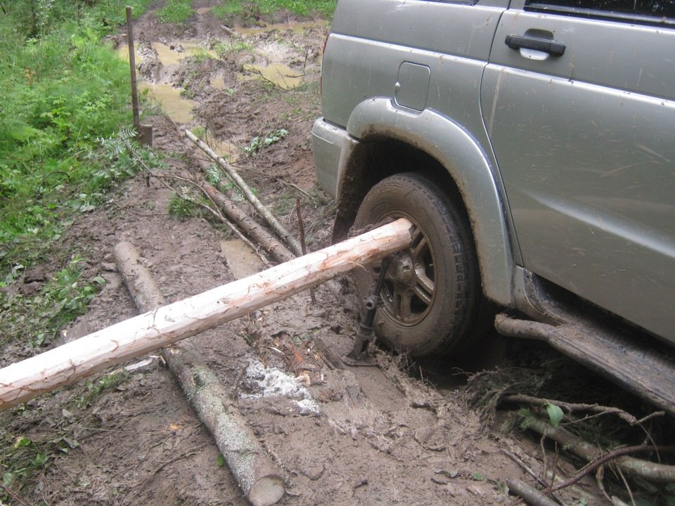 Сложности могут возникнуть и у владельцев домкратов бутылочного типа и подкатных. Первые чаще всего не во что упереть (кроме фаркопа), а под второй надо копать такую траншею, что проще откопать сам автомобиль... Тем не менее в большинстве ситуаций штатный домкрат может вам помочь, если, конечно, сперва вы поможете ему. Потому что великому Архимеду нужна была только одна точка опоры, а вам для работы понадобится две. Верхняя, та, что на автомобиле, должна быть доступна – откопана и очищена. Нижняя, та, что на земле, – укреплена, чтобы домкрат не проваливался под тяжестью автомобиля. И поверьте, дюжина веточек толщиной с карандаш не спасут. И с руку толщиной не спасут. Даже три бревна не помогут. Только доска, в крайнем случае расколотая пополам чурка размером как минимум в половину обычного листа бумаги, если у вас короткая «Нива»; если не короткая или не «Нива», то размером в лист целиком. Пята домкрата имеет свойство не только тонуть в том, в чём уже утонул автомобиль, но и соскальзывать с опоры. Излишне будет говорить, что для устойчивой установки опоры, особенно если события происходят в колее, следует откопать небольшой танковый капонир в масштабе примерно 1:35. Глубоко копать не надо — ровно настолько, чтобы домкрат удалось подсунуть под автомобиль (иначе высоты подъёма не хватит на глубину подкопа). При этом, если есть возможность подставить домкрат под рычаг подвески или мост, дело пойдёт веселей. Приподняв автомобиль, подложите под колёса всё, что найдёте: доски, палки, ветки, камни, грунт. После этого можно опустить домкрат, переставить его и опору на место, где вы не копали, и попробовать приподнять машину выше, чтобы подложить под колёса больше. Словом, чтобы успешно пользоваться штатным домкратом, кроме терпения, нужны лопата, отрезок доски для опоры и отрезок доски, чтобы засунуть под колесо. Но бывает, что штатного домкрата не хватает или его не удаётся как следует установить. Да и сломаться он может запросто, особенно ромбик. Тогда попробуйте воспользоваться дедовским методом.