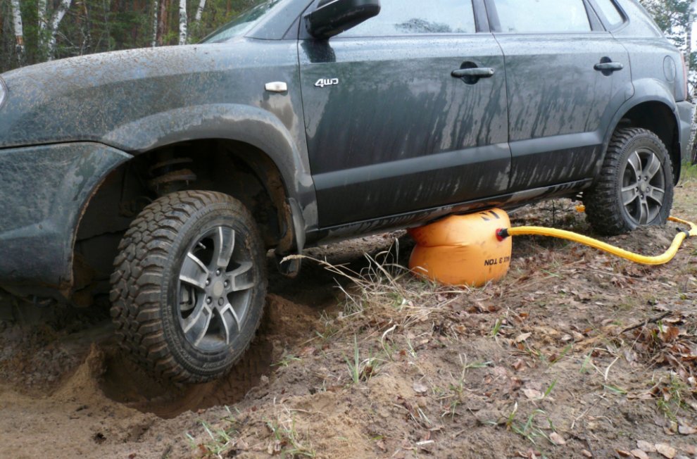 Домкрат в виде пластикового мешка, надуваемого через шланг, может быть двух видов: питаемый от выхлопной трубы или от компрессора. Существуют и переходники... Так что, если у вас всегда с собой компрессор или выхлопных две, то лучше пневматического домкрата со шлангом ничего не придумать. С ним обычно возникает только три проблемы: он выскакивает из-под машины, его можно прожечь или проткнуть, его некуда деть после использования. Но эффективность такого домкрата настолько перевешивает вышеперечисленные недостатки, что для неподготовленных машин он может стать настоящей находкой. Да, ещё одна неприятная особенность: даже в сдутом и сложенном виде он представляет собой довольно объёмистую сумку, которая занимает полбагажника Suzuki Jimny или четверть грузового отсека Renault Duster. Надувной домкрат отлично работает на любых грунтах, с любыми машинами, особенно с теми, у которых несущий кузов или интегрированная рама.