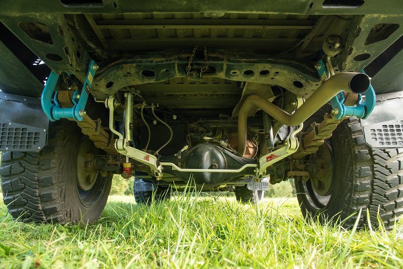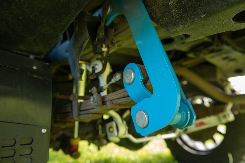 Передние амортизационные стойки Cragsman с выносными компенсационными камерами регулируются по высоте и по жёсткости, задние рессоры Ironman работают в паре с длинноходными амортизаторами и крепятся к кузову через револьверные серьги. В результате артикуляция заднего моста получилась просто фантастическая — вывесить пикап почти невозможно. А чтобы “Катран” при своих огромных ходах подвески не заваливался в поворотах, сзади установлен стабилизатор поперечной устойчивости. Двигатель и трансмиссию защищает лыжа из двух алюминиевых листов толщиной шесть миллиметров, вместо стандартного топливного бака установлен 130-литровый бак из нержавеющей стали.