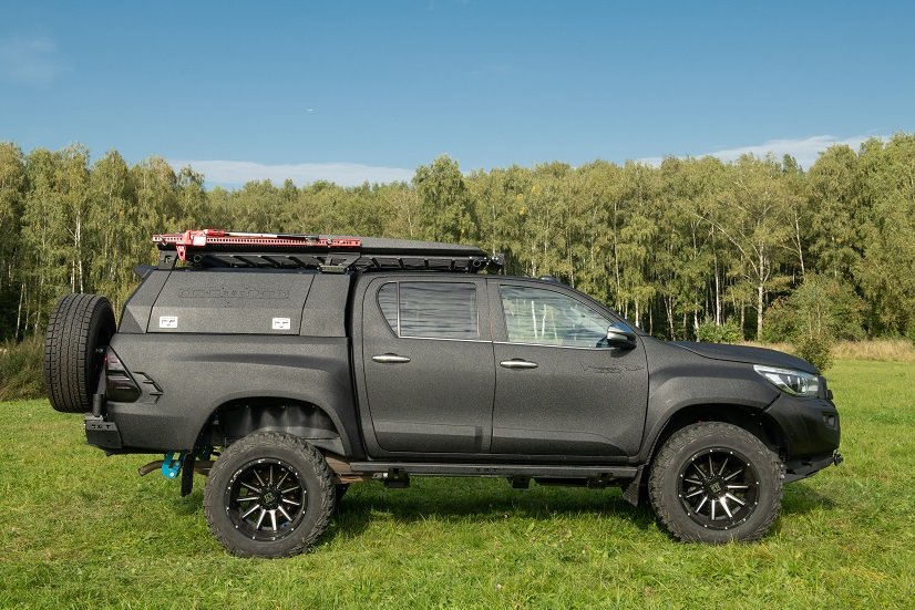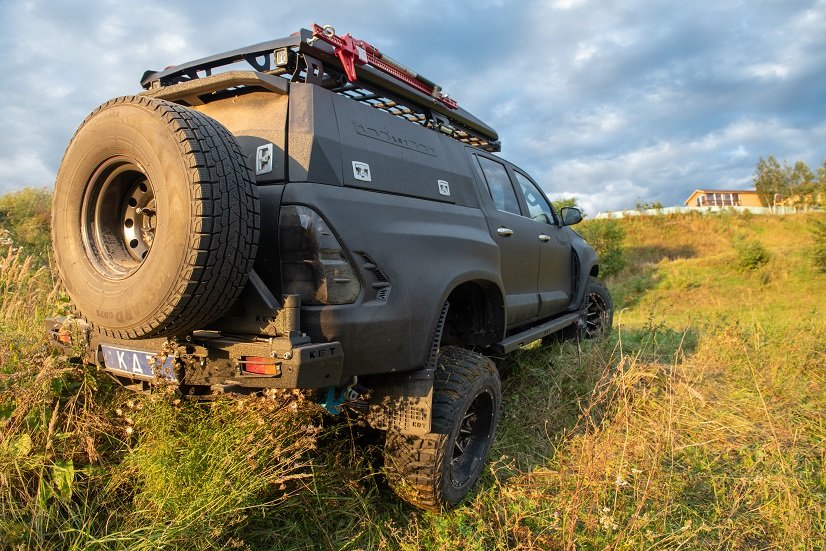 Главное здесь — оригинальный дизайн. Практически все наружные панели кузова, кроме дверей и крыши, были отрисованы на компьютере и затем изготовлены по матрицам из композитных материалов. Продуваемый насквозь капот с жабрами вентиляционных отверстий, широкие крылья с интегрированной красной подсветкой по бокам, решётка радиатора и передний бампер — пластиковые (причём толщина пластика бампера около сантиметра). Внутри спрятаны стальные усилители, то есть это серьёзная силовая конструкция, которой можно валить сухой подлесок. А для работы с хайджеком и буксировки в его нижней части есть мощные проушины. Кстати, поскольку бампер меняется в комплекте с радиаторной решёткой, его можно поставить на любой Toyota Hilux последнего поколения (начиная с 2015 года) не гадая, подойдёт ли он к заводскому фейслифту. Скрытая лебёдка, конечно, тоже имеется, при этом клюз под синтетический трос совсем не виден за откидывающейся рамкой крепления номерного знака. В дополнение к стандартной оптике в бампер врезаны диодные противотуманки, а на мощную перекладину новой радиаторной решётки легко встала диодная балка рабочего света. Широкие пластиковые крылья позволяют без дополнительных расширителей установить 35-дюймовые колеса, а мощная “калитка” на заднем силовом бампере, без проблем выдерживает тяжёлую запаску.