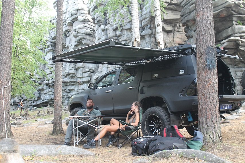 Слева по ходу — маркиза площадью пять квадратных метров. Это новая разработка KDT, она раскладывается за считанные минуты и держится на телескопических опорах из толстой пятимиллиметровой алюминиевой трубы. Здесь нет вертикальных стоек, мешающих ходить под навесом и усложняющих сборку. Сам пикап и всё навесное оборудование окрашены синтетическим покрытием Line-X чёрного цвета, надёжно защищающим кузов от царапин.