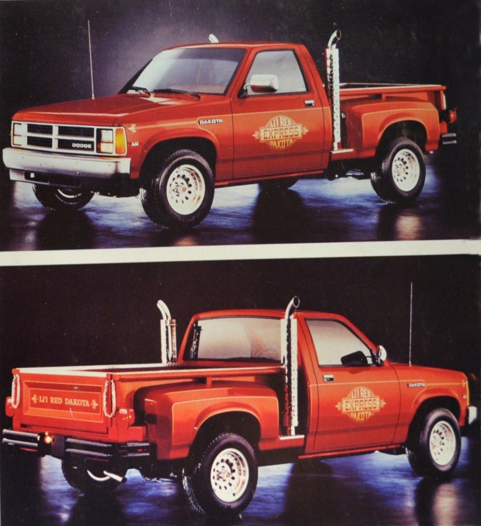 По-настоящему интересно любителям быстрых пикапов стало лишь в 1987 году, когда был представлен лёгкий грузовик Dodge Dakota на совершенно новой платформе N. Его особенностью стали размеры, которые превосходили компактные пикапы конкурентов (типа Chevy S10, GMC S15 и Ford Ranger), но при этом уступали более крупному Ram, что позволило вполне официально окрестить его среднеразмерным. База колебалась в пределах 2842–3150 мм, длина – 4724–5192 мм, ширина – 1737 мм, а высота – 1704 мм (в версии 4х4). Для сравнения, длина/ширина S10/S15 (при базе 2751 мм) составляла 4475/1646 мм, а у Ram с базой 3327 мм соответственно 5354/2019 мм. Грузоподъёмность Dakota – 570–1130 кг. Тогда в статьях новую машину пафосно величали «самым горячим пикапом в городе», хотя до показателей славных предшественников из 1970-х ему было далеко. Топовый мотор V6 рабочим объёмом 3.9 л оказался разочарованием для любителей чего погорячей. Ведь он представлял собой старый V8 5.2 л (OHV, конечно), обрезанный на 2 цилиндра, и с одним карбюратором развивал 125 л.с. при 4000 об/мин.