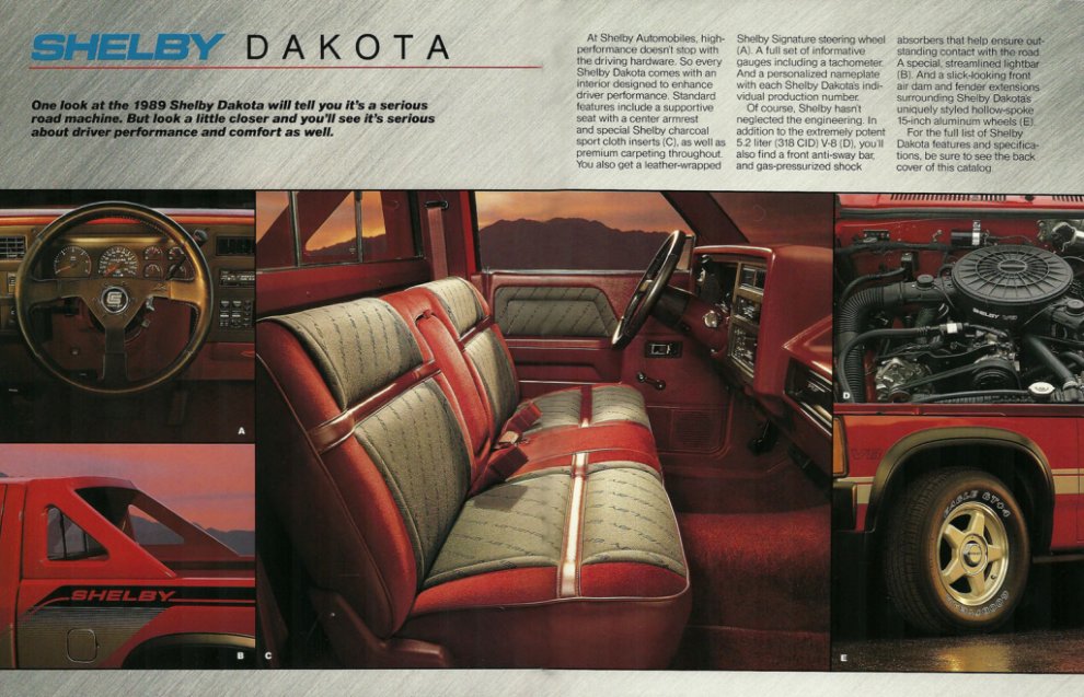 1989 год. Кэрол Шелби наконец-то выпускает масл-пикап Shelby Dakota 5.2 л со 175 л.с. и 8,7 сек. до сотни. Из 1,5 тысяч проданных Shelby две трети были покрашены в красный цвет, а остальные – в белый