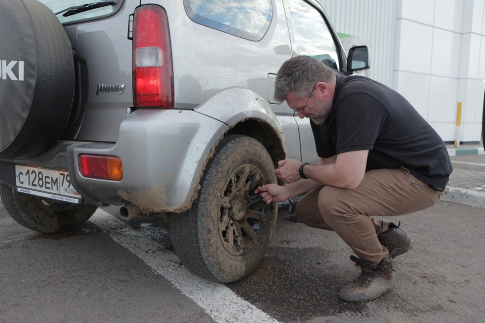 В сочетании с широкими продольными канавками это должно было заметно снизить скорость сползания, если не устранить его совсем. Наш оператор встал на порожек, откренивая Jimny. Остальное за Viatti, и они не подвели. Рывок вперёд – и мы перескакиваем самое глубокое место овражка, лязгаем подвеской и выкарабкиваемся на ровное, лишь слегка чиркнув бортом по песку и высокой траве. После мы измерили давление, и оказалось, что во всех четырёх колёсах оно разное – от 0.25 до 0.8 атм. Несмотря на сложный рельеф и резкое изменение нагрузки непосредственно на шину (в том числе и осевой), резина удержалась на диске, а под закраину, вопреки моим опасениям, не попал ни песок, ни щебень. Спущенное колесо представляло собой классическую грушу, максимально расширяясь у самой плечевой зоны и заставляя ещё раз пожалеть об отсутствии грунтозацепов. Накачав колёса до грейдерных 1.8 атм, мы поехали искать грязь. Ниже сдуваться не рекомендую, риск заноса возрастает многократно.