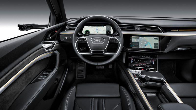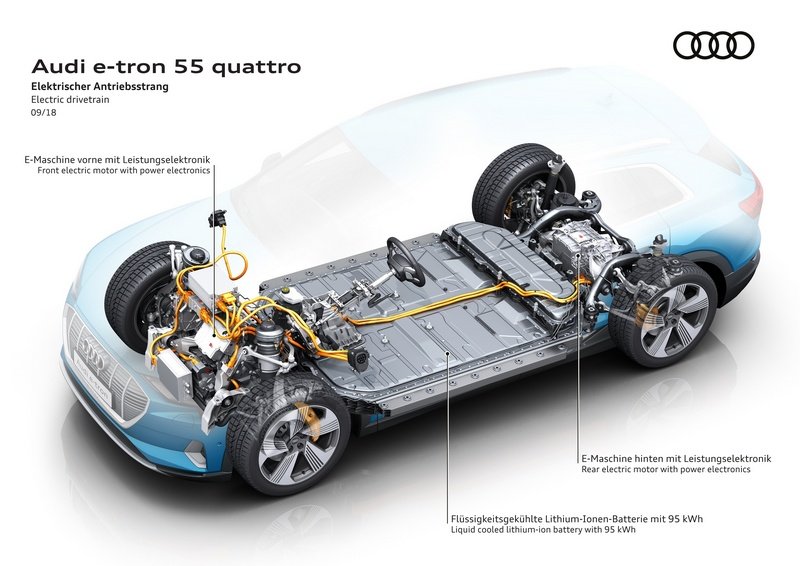 На электрокроссовер Audi устанавливается батарея ёмкостью 95 кВт/ч, состоящая из 36 ячеек, которые можно менять по отдельности. Батарея направляет ток на два асинхронных электромотора (привод полный) с одноступенчатыми планетарными редукторами, передающими тягу на колёса с помощью дифференциалов. Если пользоваться стандартной терминологией, вся эта электрическая красота развивает 408 л.с. мощности и 660 Нм момента, доступного прямо со старта. Ураган? Безусловно! Однако разгон до сотни ограничили хоть и скромными, но вполне достаточными 6,6 секунды, а максимальную скорость — 200 км/ч. Зачем? А затем, что постоянная езда с высокой скоростью быстрее обнуляет батарею, а перспектива встать посреди федеральной трассы «Лена» или автобана под Мюнхеном вряд ли кого-то обрадует — «прикурить» никто не даст, да и бензина до ближайшей заправки не плеснёт.