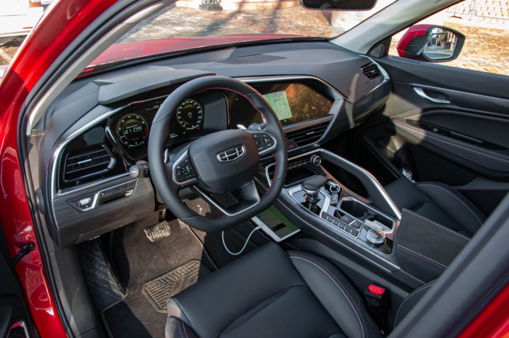 Под капотом здесь — 2.0-литровый четырёхцилиндровый турбированный двигатель JLH-4G20TD, который в разных версиях выдаёт от 190 до 245 л.с. У Tugella — 238 л.с. и 350 Нм момента. Коробка передач — восьмиступенчатая Aisin, причём (и Geely на этом настаивает) именно японского производства. Полный привод — BorgWarner. В общем, вылитая Volvo. Только дешевле и в другой формате.