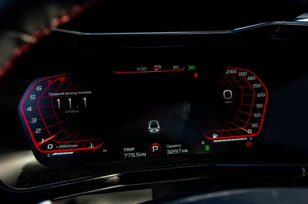 Опять же, привет от Volvo — режимы движения у Geely Tugella задействованы в полном объёме: «Экономичный», «Комфорт», «Спорт», «Офф-роуд» и «Глубокий снег». Испытали буквально все. Здесь, как у бюджетных автомобилей, не задушена педаль газа под режимы «Эко» или «Комфорт», а в «Спорте» она становится такой, какой должна быть. У Tugella даже в «Комфорте» и «Экономичном» получается ехать вполне активно, не испытывая недостатка в динамике и мощности. А в «Спорте» двигатель начинает крутиться чуть ли не до 6000 оборотов, передачи становятся длиннее, а до 8 передачи коробка не добирается в принципе.