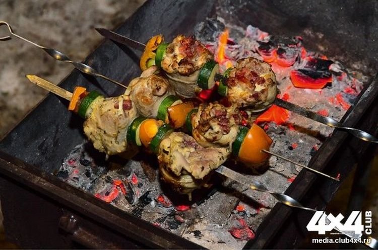 Но ведь есть ещё рыба и птица! Шашлыки из осетра мы уже делали, а куриные окорочка в лесу жарят и без нас достаточно часто — дело нехитрое и им никого не удивишь. А вот куриным шашлыком удивить можно, если, конечно, немного повозиться. Впрочем, сложность предлагаемого рецепта мнимая, навык разделки курицы таким манером приходит буквально со второго подхода, а третий окорочок залетает на шампур за одну минуту.