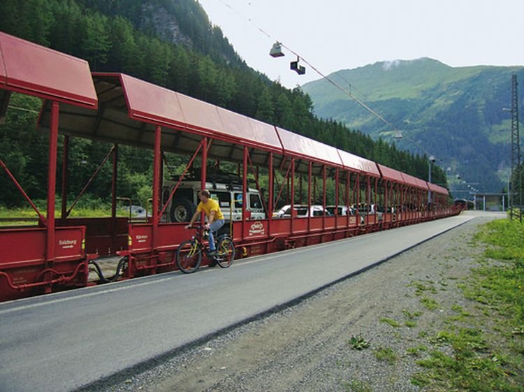 Альпы преодолевали по обозначенным на картах пунктирам. Один из них как-то плавно перетекал в железную дорогу: либо там тупик, либо ещё что-то, нам пока неведомое. Двинулись навстречу неизвестности. Но всё оказалось прозаичнее и точно так, как было нарисовано в атласе, — дорога заканчивается железнодорожной станцией. Автомобили за небольшие деньги быстро ставят на платформы, их экипажи занимают места в комфортабельном вагоне — и поезд отправляется в путь через двадцатикилометровый туннель. А дальше опять горная дорожка. Примерно то же самое год назад мы видели в Норвегии, но там шоссе неожиданно оборвалось въездом на паром.