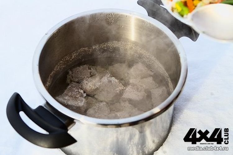 Подобные блюда очень удобно готовить в скороварке, да и вообще брать с собой скороварку в зимние покатушки – беспроигрышный вариант. Независимо от производителя, это кастрюля с толстым дном и герметично закрывающейся крышкой. Она очень практична, поскольку давление в герметичном пространстве увеличивается. Повышается и температура кипения воды (со 100 °С до примерно 120 °С), а за счёт этого продукты готовятся в 3–4 раза быстрее. Но самое важное, на мой взгляд, именно то, что мясо не требуется размораживать перед варкой, и ничего страшного, что на кусочках из-за высокой температуры образуется небольшой слой пористого «суфле» – это выделившийся и мгновенно загустевший белок. При обычной варке он собирается на поверхности воды в виде пены, которую обычно удаляют, чтобы бульон оставался прозрачным. Привычка, кстати, спорная. В пене много полезных веществ, и ресторанные повара её оставляют, а в нашем же случае она вообще не смешивается с водой и бульон остается идеально прозрачным, а мясо мягким, так как, несмотря на очень высокую температуру, оно сохраняет внутреннюю влагу из-за короткого времени варки.