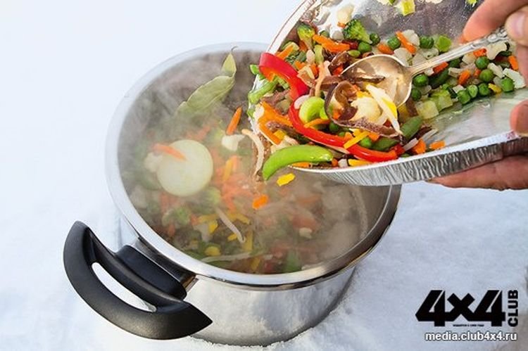Я не очень люблю готовить из мяса в дороге просто потому, что летом это продукт скоропортящийся, а зимой в лесу его непонятно как размораживать. В холода вообще всё сложнее – замерзают, а значит приходят в негодность, почти все ингредиенты, кроме, естественно, тех, которые изначально покупаются замороженными.