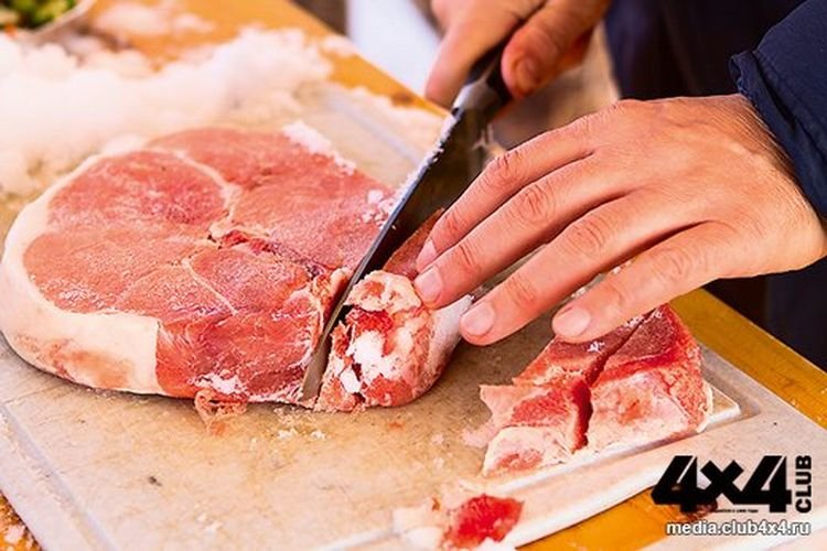 Для подобного способа готовки, лучше брать части мяса без костей, которые уже изначально разделаны поперёк волокон и на морозе остаётся только разделить их на небольшие кусочки. Свинина, кстати, отлично режется в замороженном виде – во время готовки на улице было около минус 20 °С.