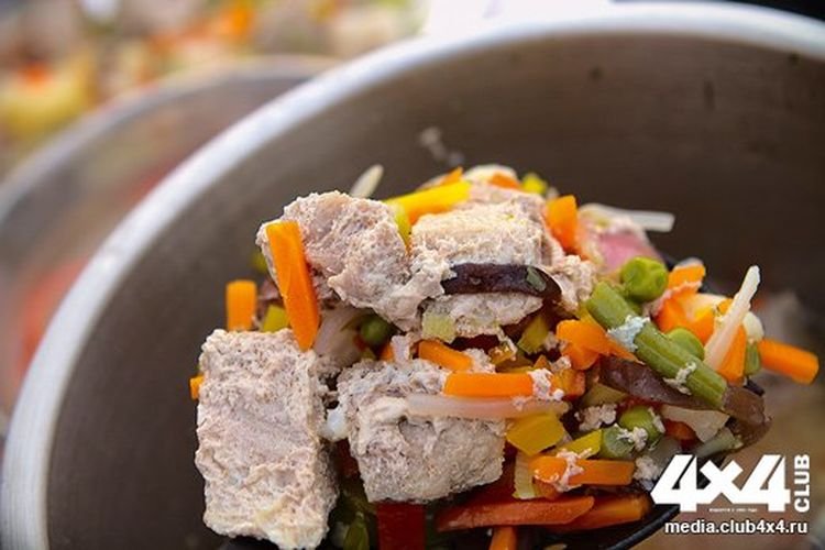 Лучше не разделять блюдо на суп и второе, а подать его именно так, как ели крестьяне: всё в одной глубокой металлической миске, наиболее удобной посуде на морозе – в любой момент блюдо можно подогреть на бензиновой горелке.
