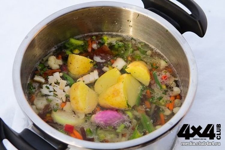 Тарелка горячего густого и сытного супа на мясном бульоне, не даст вам замёрзнуть в зимнюю стужу. Была бы с собой скороварка!