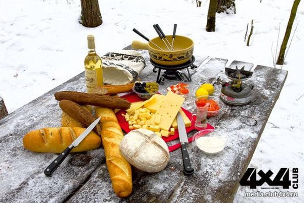 Фондю на берегу зимней речки? Почему бы и нет. Ведь, если верить легендам, оно служило основным блюдом пастухов в швейцарских Альпах: сыр, вино и хлеб всегда были под рукой. Классический рецепт фондю невероятно прост: в расплавленный в специальном горшочке сыр окунают кусочки хлеба.