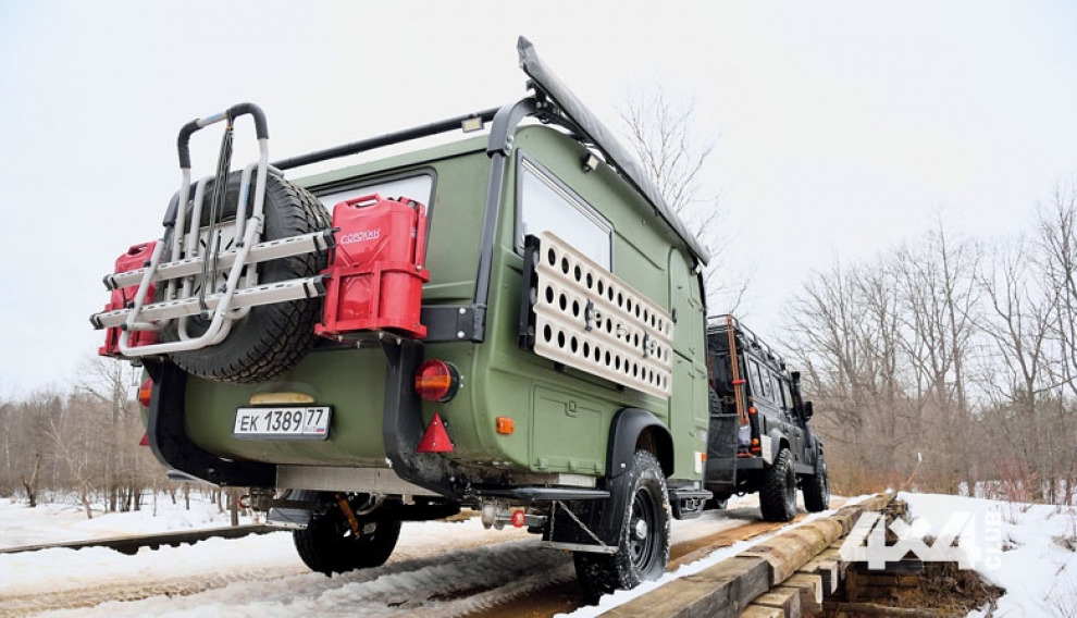 Сзади прикреплены канистры, в которых можно везти топливо для отопителя или автомобиля-тягача. Между ними — кронштейн с запасным колесом, на креплении которого, в свою очередь, установлен подвес на два велосипеда. Задняя балка рамы оснащена мощной буксировочной проушиной. Она пригодится, если потребуется вытащить застрявший автопоезд назад или наоборот поддёрнуть кого-нибудь автопоездом вперёд. Кстати, выхлопная труба независимого дизельного отопителя салона Eberspacher тоже выведена назад. Задние фонари оставили круглыми, в ретро-стиле, но оригинальные заменили современными. Фары заднего освещения питаются от электросети прицепа, чтобы не зависеть от того, каким тягачом прицеп будут тянуть. При маневрировании задним ходом в ограниченном пространстве их очень удобно включать, приоткрыв верхнюю половинку двери.