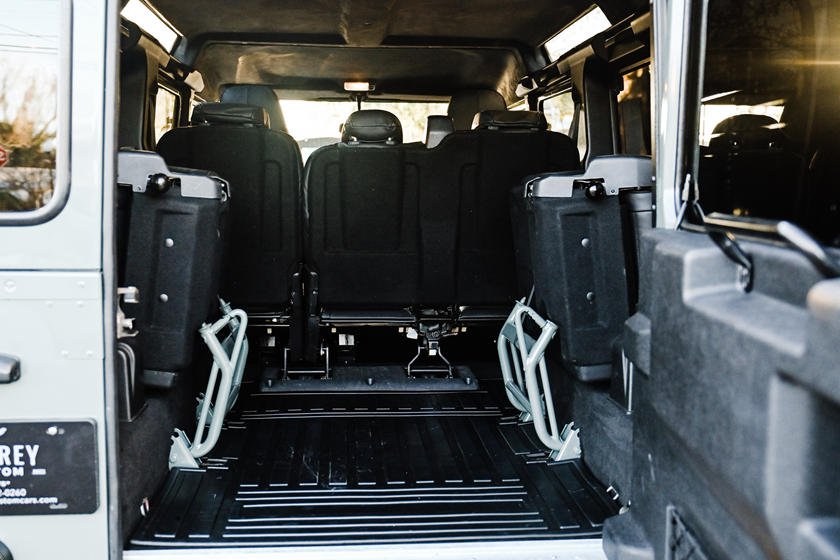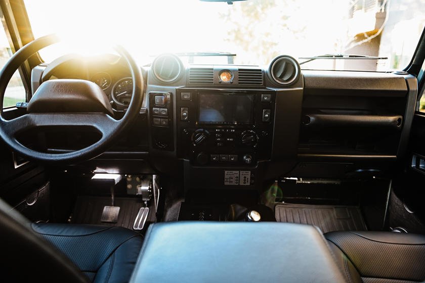 Интерьер этого 110-го выглядит премиальнее, чем у любого из крупных немецких брендов: алюминиевая отделка дверей, чёрные «автобиографические» сиденья с подогревом и торпедо из алькантары. Среди прочих удобств кондиционеры для первого и второго ряда сидений, круиз-контроль и специальная консоль с портами для зарядки телефонов. Информационно-развлекательная система состоит из двухдинового Alpine double din stereo с Bluetooth, интеграцией Apple CarPlay, Google Auto и динамиками JL. Помимо этого, существенно улучшена звукоизоляция салона.