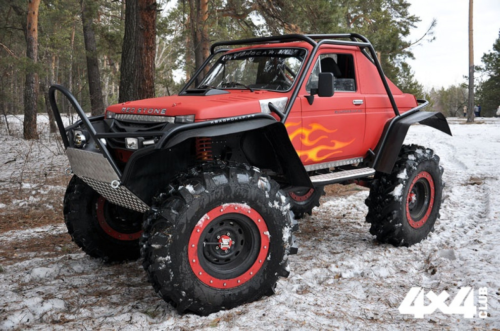 На этом месте, по сценарию, звучат фанфары и красиво стареющий конферансье голосом, привычным к цирковой арене, объявляет: «Дамы и господа! Смертельный номер! Впервые на арене невероятный квадрокар, созданный из „Нивы“ — Red Stone!» Но у нас издание профессиональное, да и с барабанами проблема, поэтому мы просто представляем фотографии, где можно в деталях увидеть воплощение смелой идеи.
