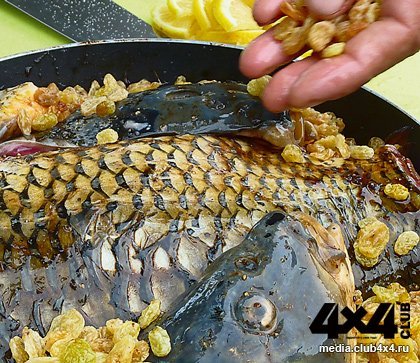 Кружки лимонов рассекаем на четыре части и вместе с изюмом рассыпаем по сковороде и карпам. Особенно оригинальными на вкус будут те ягодки, которые приготовятся не в пиве, а на пару, на спинке рыбы.