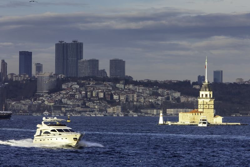 Девичья башня — один из символов города, на фоне небоскрёбов азиатской части.