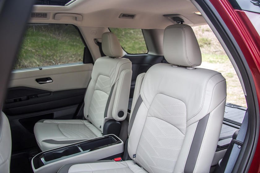 В салоне «Патфайндер» много места для ног пассажиров второго ряда, хотя третий ряд, как и положено в этом сегменте, рассчитан скорее на детей. Сиденья могут быть отделаны тканью, кожей или премиальной стёганой кожей различных цветов. Также доступен трёхзонный автоматический климат-контроль и подогрев задних сидений. Во всех комплектациях Pathfinder прекрасная шумоизоляция, с использованием акустически-ламинированного лобового стекла, более толстых стёкол второго ряда и плотным ковровым покрытием.