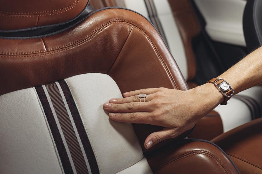Мягкая белая кожа с кремовой замшей, «вдохновлена циферблатами часов Shinola и сбалансирована медными акцентами», но особое внимание привлекают текстильные полосы на кожаных креслах...