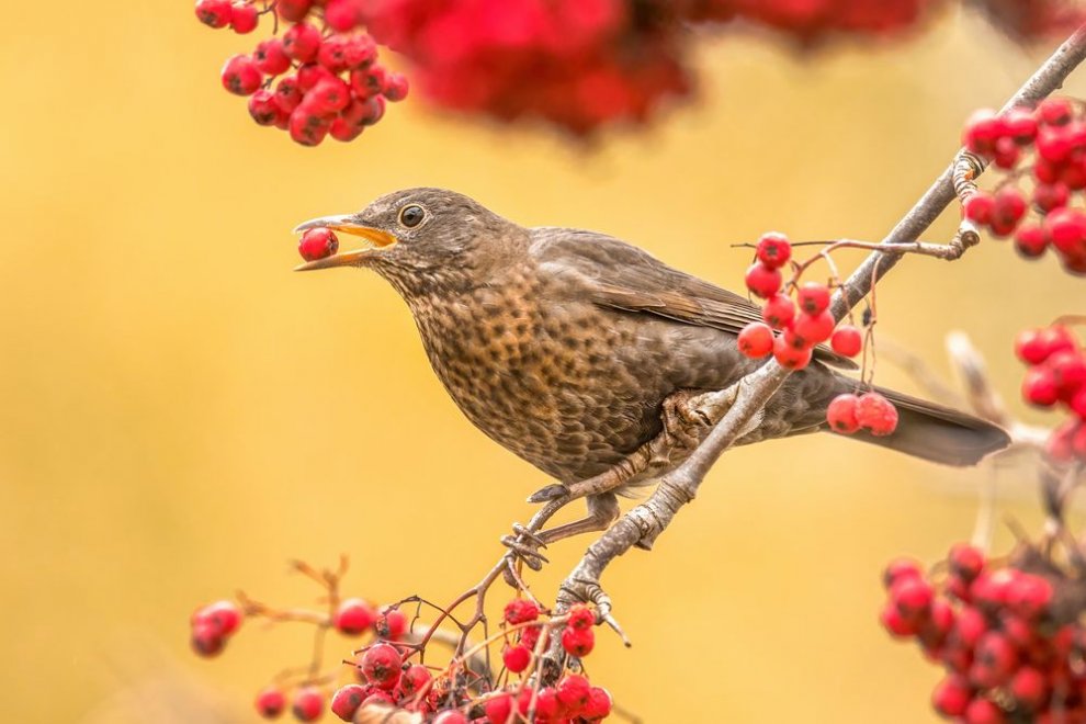 Чёрный дрозд (самка). А вот чёрные дрозды улетают (хотя, единичные особи зимуют и в Москве) на наш юг, где добывают корм, копаясь в опавшей листве и высохшей траве. Правда, мигрируют они много позже тех же горихвосток, потому что могут питаться созревшими ягодами и плодами, остающимися на деревьях и кустарниках.